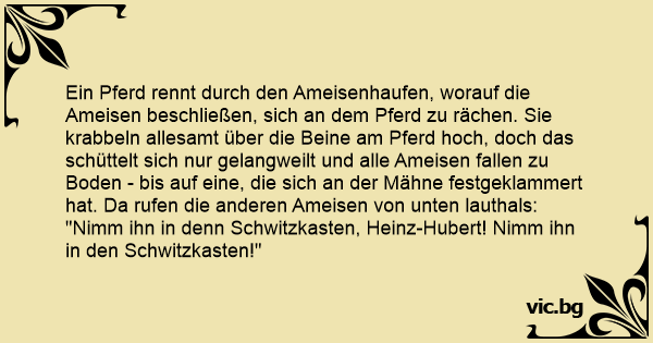 Ein Pferd rennt durch den Ameisenhaufen, worauf die Ameisen beschließen, sich an dem Pferd zu rächen. Sie krabbeln allesamt über die Beine am Pferd hoch, doch das schüttelt sich nur gelangweilt und alle Ameisen fallen zu Boden - bis auf eine, die sich an der Mähne festgeklammert hat. Da rufen die anderen Ameisen von unten lauthals:
