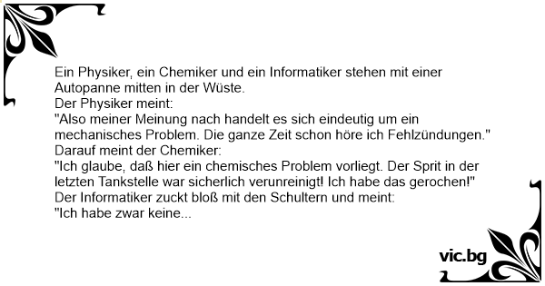 Ein Physiker, ein Chemiker und ein Informatiker stehen mit einer Autopanne mitten in der Wüste.