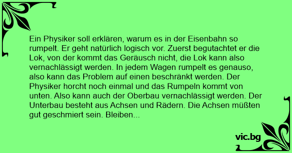 Ein Physiker soll erklären, warum es in der Eisenbahn so rumpelt. Er geht natürlich logisch vor. Zuerst begutachtet er die Lok, von der kommt das Geräusch niсhт, die Lok kann also vernachlässigt werden. In jedem Wagen rumpelt es genauso, also kann das Problem auf einen beschränkt werden. Der Physiker horcht noch einmal und das Rumpeln kommt von unten. Also kann auch der Oberbau vernachlässigt werden. Der Unterbau besteht aus Achsen und Rädern. Die Achsen müßten gut geschmiert sein. Bleiben die Räder. Die Räder können mit guter mathematischer Genauigkeit als Kreise beschrieben werden.