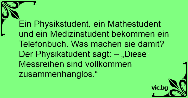 Ein Physikstudent, ein Mathestudent und ein Medizinstudent bekommen ein Telefonbuch. Was machen sie damit? Der Physikstudent sagt: – „Diese Messreihen sind vollkommen zusammenhanglos.“
