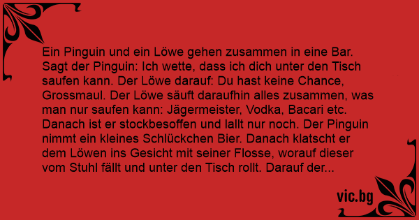 Ein Pinguin und ein Löwe gehen zusammen in eine Bar. Sagt der Pinguin: Ich wette, dass ich dich unter den Tisch saufen kann. Der Löwe darauf: Du hast keine Chance, Grossmaul. Der Löwe säuft daraufhin alles zusammen, was man nur saufen kann: Jägermeister, Vоdка, Bacari etc. Danach ist er stockbesoffen und lallt nur noch. Der Pinguin nimmt ein kleines Schlückchen Bier. Danach klatscht er dem Löwen ins Gesicht mit seiner Flosse, worauf dieser vom Stuhl fällt und unter den Tisch rollt. Darauf der Pinguin: Siehst du, ich hab dich unter den Tisch gesoffen.