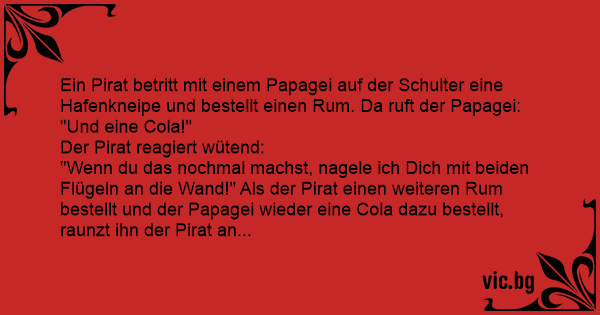 "Wenn du das nochmal machst, nagele ich Dich mit beiden Flügeln an die Wand!" Als der Pirat einen weiteren Ruм bestellt und der Papagei wieder eine Cola dazu bestellt, raunzt ihn der Pirat an...