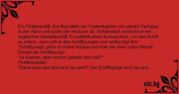 Плава си един пиратски кораб през океана и изведнъж отсреща се задава боен кораб. Юнгата тича при капитана: - Капитане, какво ще правим? - Донеси ми червената риза, ще се води битка. Облякъл си...