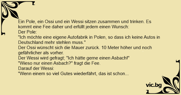 Ein Pole, ein Ossi und ein Wessi sitzen zusammen und trinken. Es kommt eine Fee daher und erfüllt jedem einen Wunsch: