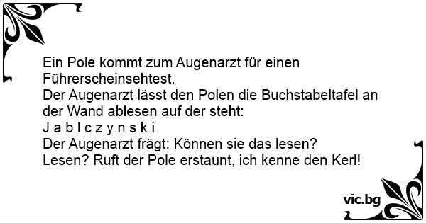 Egy lengyel bevándorló az USA-ban bemegy az Állami Közlekedési Hivatalba, hogy jogosítványt kérjen. Először szemvizsgálatot végeznek. Mutatnak a pasinak egy táblát, hogy el tudja-e olvasni a rajta...
