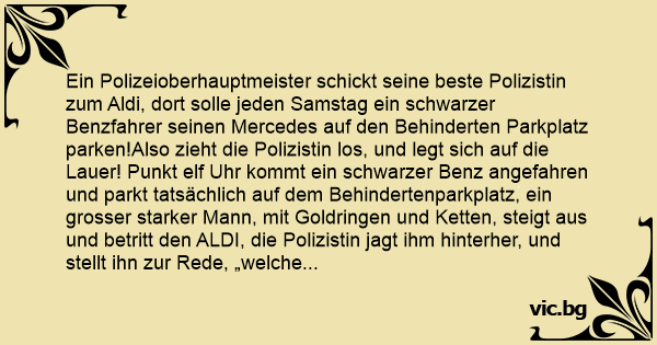 Ein Polizeioberhauptmeister schickt seine beste Polizistin zum Aldi, dort solle jeden Samstag ein schwarzer Benzfahrer seinen Mercedes auf den Behinderten Parkplatz parken!Also zieht die Polizistin los, und legt sich auf die Lauer! Punkt elf Uhr kommt ein schwarzer Benz angefahren und parkt tatsächlich auf dem Behindertenparkplatz, ein grosser starker Mann, mit Goldringen und Ketten, steigt aus und betritt den ALDI, die Polizistin jagt ihm hinterher, und stellt ihn zur Rede, „welche Behinderung doch vorläge, dass er den Behindertenparkplatz benutze???“