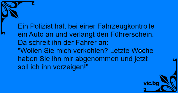 Polisen: - Kan jag få se ert körkort? - Nej, nu får det vara nog. Ni tog ju mitt körkort förra veckan. Hur många körkort tror du att jag har?