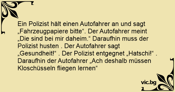 Ein Polizist hält einen Autofahrer an und sagt „Fahrzeugpapiere bitte“. Der Autofahrer meint „Die sind bei mir daheim.“ Daraufhin muss der Polizist husten . Der Autofahrer sagt „Gesundheit!“ . Der Polizist entgegnet „Hatschi!“ . Daraufhin der Autofahrer „Ach deshalb müssen Kloschüsseln fliegen lernen“