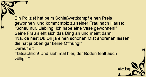 Ein Polizist hat beim Schießwettkampf einen Preis gewonnen und kommt stolz zu seiner Frau nach Hause: