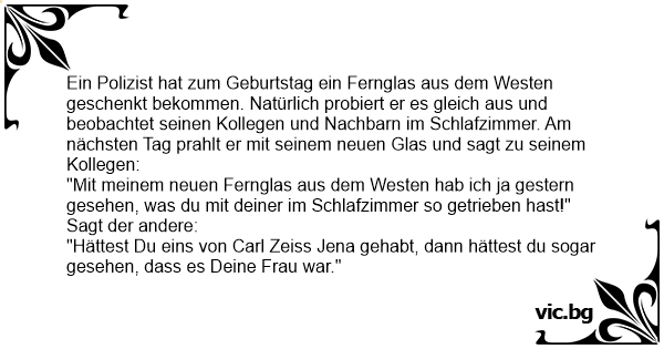 Ein Polizist hat zum Geburtstag ein Fernglas aus dem Westen geschenkt bekommen. Natürlich probiert er es gleich aus und beobachtet seinen Kollegen und Nachbarn im Schlafzimmer. Am nächsten Tag prahlt er mit seinem neuen Glas und sagt zu seinem Kollegen: