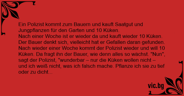 Nach einer Woche ist er wieder da und kauft wieder 10 Küken. Der Bauer denkt sich, vielleicht hat er Gefallen daran gefunden. Nach wieder einer Woche kommt der Polizist wieder und will 10 Küken. Da fragt ihn der Bauer, wie denn alles so wächst. "Nun", sagt der Polizist, "wunderbar – nur die Küken wollen niсhт – und ich weiß niсhт, was ich falsch mache. Pflanze ich sie zu tief oder zu dicht beieinander?"