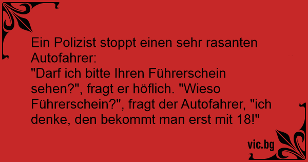 "Darf ich bitte Ihren Führerschein sehen?", fragt er höflich. "Wieso Führerschein?", fragt der Autofahrer, "ich denke, den bekommt man erst mit 18!"