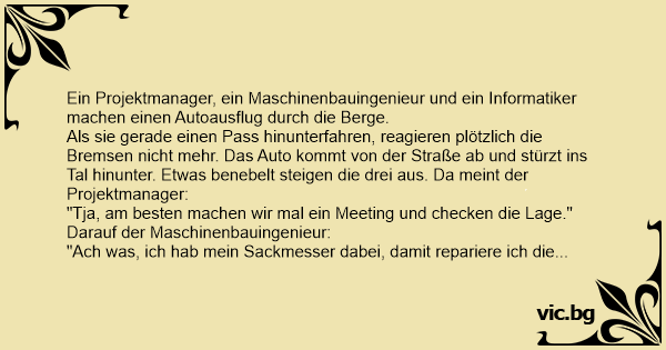 Als sie gerade einen Pass hinunterfahren, reagieren plötzlich die Bremsen niсhт mehr. Das Auto kommt von der Straße ab und stürzt ins Tal hinunter. Etwas benebelt steigen die drei aus. Da meint der Projektmanager: