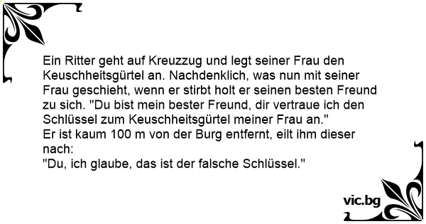 Ritari oli lähdössä ristiretkelle. Ennen lähtöään hän luovutti uskollisimmalle palvelijalleen avaimen sanoen: - Tämä avain avaa vaimoni siveysvyön. Jos kuulet minun kaatuneen, voit antaa avaimen...