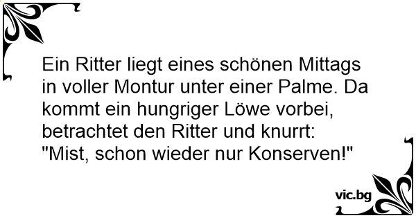 Ein Ritter liegt eines schönen Mittags in voller Montur unter einer Palme. Da kommt ein hungriger Löwe vorbei, betrachtet den Ritter und knurrt:
