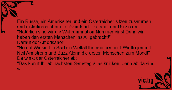 En Ryss, en Amerikan och en Arab satt och pratade.. Ryssen: - Vi var först i rymden Amerikanen: - Ja, men vi var först på månen! Araben: - Vi ska bli dom första på solen! Ryssen och Amerikanen: - Ni kommer brinna upp innan ni är framme! Araben: - Bror, vi ska dit på kvällen..