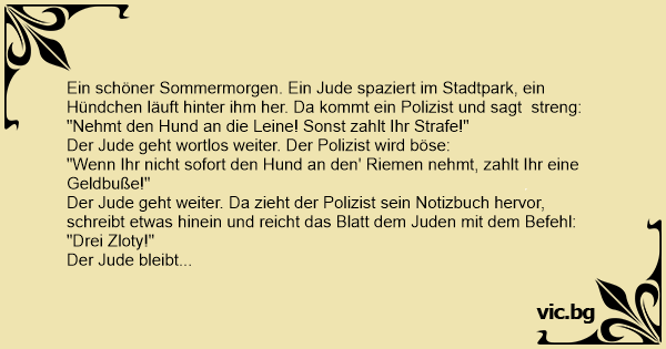 Ein schöner Sommermorgen. Ein Jude spaziert im Stadtpark, ein Hündchen läuft hinter ihm her. Da kommt ein Polizist und sagt streng: