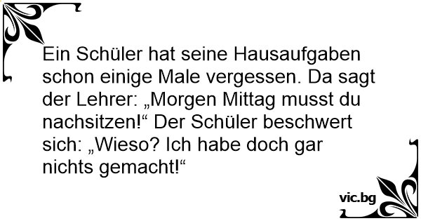 Ein Schüler hat seine Hausaufgaben schon einige Male vergessen. Da sagt der Lehrer: „Morgen Mittag musst du nachsitzen!“ Der Schüler beschwert sich: „Wieso? Ich habe doch gar nichts gemacht!“