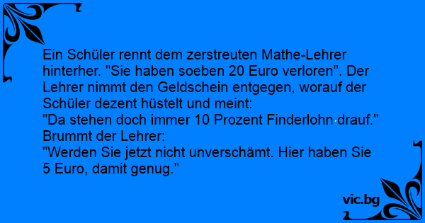 Ein Schüler rennt dem zerstreuten Mathe-Lehrer hinterher. "Sie haben soeben 20 Euro verloren". Der Lehrer nimmt den Geldschein entgegen, worauf der Schüler dezent hüstelt und meint: