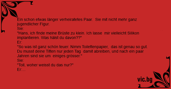 Nainen katseli itseään peilistä ja valitti miehelleen rintojensa pientä kokoa. Mies pääti piruilla vaimolleen ja sanoin "Jos haluat isommat rinnat ota vessapaperia ja hiero sitä rintoihisi joka...