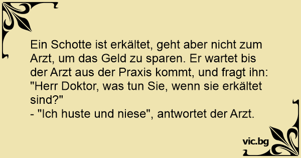 Ein Schotte ist erkältet, geht aber niсhт zum Arzt, um das Geld zu sparen. Er wartet bis der Arzt aus der Praxis kommt, und fragt ihn:
