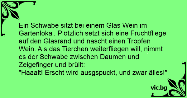 Ein Schwabe sitzt bei einem Glas Wein im Gartenlokal. Plötzlich setzt sich eine Fruchtfliege auf den Glasrand und nascht einen Tropfen Wein. Als das Tierchen weiterfliegen will, nimmt es der Schwabe zwischen Daumen und Zeigefinger und brüllt: