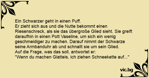 Er zieht sich aus und die Nuтте bekommt einen Riesenschreck, als sie das übergroße Glied sieht. Sie greift daraufhin in einen Pott Vaseline, um sich ein wenig geschmeidiger zu machen. Darauf nimmt der Schwarze seine Armbanduhr ab und schnallt sie um sein Glied.