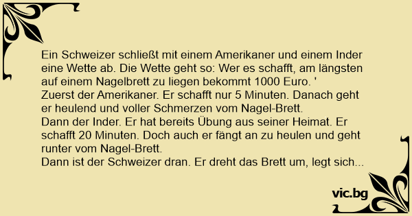 Ein Schweizer schließt mit einem Amerikaner und einem Inder eine Wette ab. Die Wette geht so: Wer es schafft, am längsten auf einem Nagelbrett zu liegen bekommt 1000 Euro. '