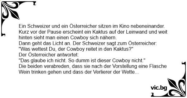Ein Schweizer und ein Österreicher sitzen im Kino nebeneinander. Kurz vor der Pause erscheint ein Kaktus auf der Leinwand und weit hinten sieht man einen Cowboy sich nähern.