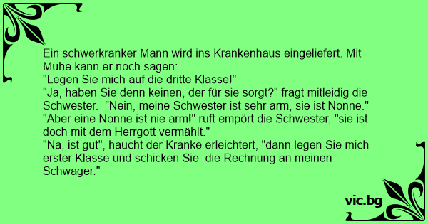 "Na, ist gut", haucht der Kranke erleichtert, "dann legen Sie mich erster Klasse und schicken Sie die Rechnung an meinen Schwager."