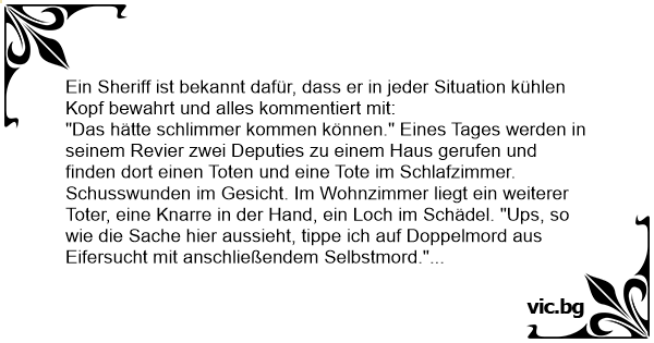 Ein Sheriff ist bekannt dafür, dass er in jeder Situation kühlen Kopf bewahrt und alles kommentiert mit: