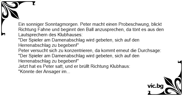 Ein sonniger Sonntagmorgen. Peter macht einen Probeschwung, blickt Richtung Fahne und beginnt den Ball anzusprechen, da tönt es aus den Lautsprechern des Klubhauses:
