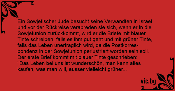 Ein Sowjetischer Jude besucht seine Verwandten in Israel und vor der Rückreise verabreden sie sich, wenn er in die Sowjetunion zurückkommt, wird er die Briefe mit blauer Tinte schreiben, falls es ihm gut geht und mit grüner Tinte, falls das Leben unerträglich wird, da die Postkorres- pondenz in der Sowjetunion perlustriert worden sein soll. Der erste Brief kommt mit blauer Tinte geschrieben: