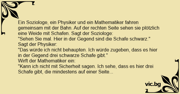 Ein Soziologe, ein Physiker und ein Mathematiker fahren gemeinsam mit der Bahn. Auf der rechten Seite sehen sie plötzlich eine Weide mit Schafen. Sagt der Soziologe: