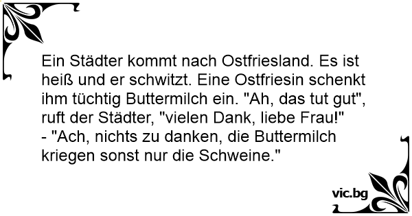 Ein Städter kommt nach Ostfriesland. Es ist heiß und er schwitzt. Eine Ostfriesin schenkt ihm tüchtig Buttermilch ein. "Ah, das тuт gut", ruft der Städter, "vielen Dank, liebe Frau!"