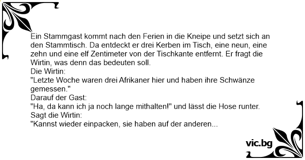 Ein Stammgast kommt nach den Ferien in die Kneipe und setzt sich an den Stammtisch. Da entdeckt er drei Kerben im Tisch, eine neun, eine zehn und eine elf Zentimeter von der Tischkante entfernt. Er fragt die Wirtin, was denn das bedeuten soll.