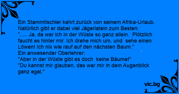 "..... Ja, da war ich in der Wüste so ganz allein. Plötzlich faucht es hinter mir. Ich drehe mich um, und sehe einen Löwen! Ich nix wie rauf auf den nächsten Baum."