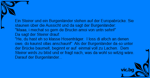 "He, du hast eh so klasse Hosenträger. I loss di afoch an denen owe, do kaunst ollas anschaun!" Als der Burgenländer da so unter der Brücke baumelt, beginnt er auf einmal voll zu Lachen. Dem Steirer wirds zu blöd und er fragt nach, was da wohl so witzig wäre.