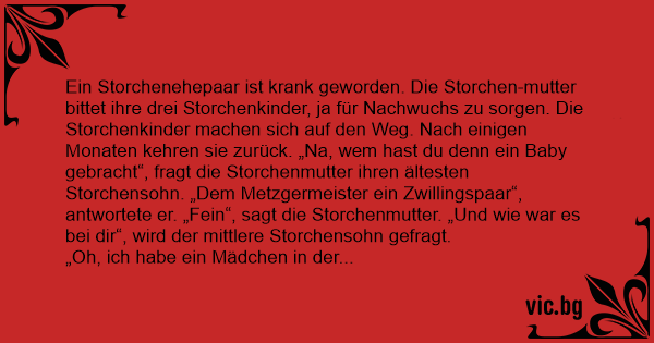 Ein Storchenehepaar ist krank geworden. Die Storchen-mutter bittet ihre drei Storchenkinder, ja für Nachwuchs zu sorgen. Die Storchenkinder machen sich auf den Weg. Nach einigen Monaten kehren sie zurück. „Na, wem hast du denn ein Baby gebracht“, fragt die Storchenmutter ihren ältesten Storchensohn. „Dem Metzgermeister ein Zwillingspaar“, antwortete er. „Fein“, sagt die Storchenmutter. „Und wie war es bei dir“, wird der mittlere Storchensohn gefragt.