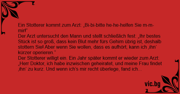 Der Arzt untersucht den Mann und stellt schließlich fest: „Ihr bestes Stück ist so groß, dass kein Blut mehr fürs Gehirn übrig ist, deshalb stottern Sie! Aber wenn Sie wollen, dass es aufhört, kann ich ‚ihn‘ kürzer operieren.“