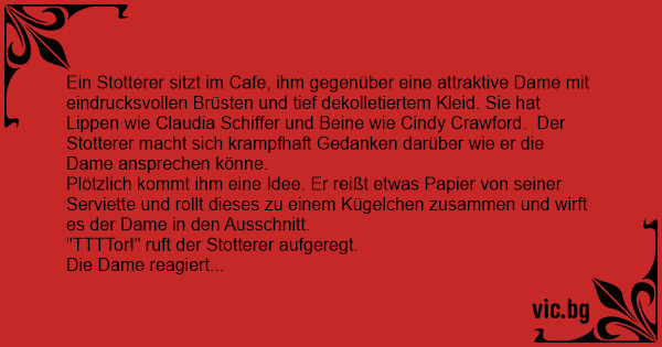 Ein Stotterer sitzt im Cafe, ihm gegenüber eine attraktive Dame mit eindrucksvollen Brüsten und tief dekolletiertem Kleid. Sie hat Lippen wie Claudia Schiffer und Beine wie Cindy Crawford. Der Stotterer macht sich krampfhaft Gedanken darüber wie er die Dame ansprechen könne.