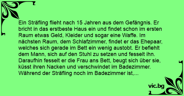 Et ægtepar bliver overrumplet at en indbrudstyv. Han binder dem til sengen og bøjer sig ned og kysser kvinden på kinden. Derefter går han ud på badeværelset. Manden siger til konen: Jeg så godt han...