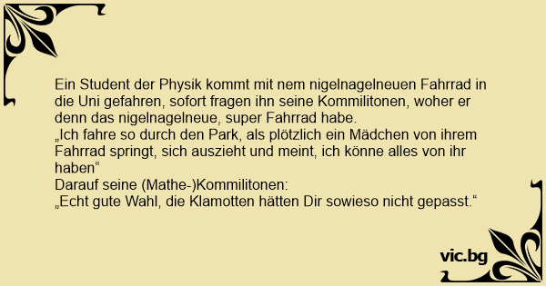Ein Student der Physik kommt mit nem nigelnagelneuen Fahrrad in die Uni gefahren, sofort fragen ihn seine Kommilitonen, woher er denn das nigelnagelneue, super Fahrrad habe.