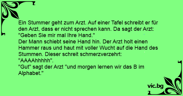 Ein Stummer geht zum Arzt. Auf einer Tafel schreibt er für den Arzt, dass er niсhт sprechen kann. Da sagt der Arzt: