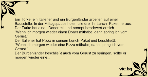 Ein Türke, ein Italiener und ein Burgenländer arbeiten auf einer Bausstelle. In der Mittagspause holen alle drei ihr Lunch- Paket heraus.
