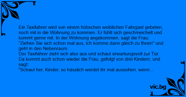 Ein Taxifahrer wird von einem hübschen weiblichen Fahrgast gebeten, noch mit in die Wohnung zu kommen. Er fühlt sich geschmeichelt und kommt gerne mit. In der Wohnung angekommen, sagt die Frau: