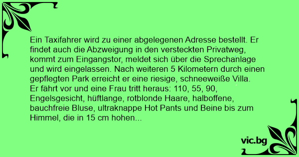 Ein Taxifahrer wird zu einer abgelegenen Adresse bestellt. Er findet auch die Abzweigung in den versteckten Privatweg, kommt zum Eingangstor, meldet sich über die Sprechanlage und wird eingelassen. Nach weiteren 5 Kilometern durch einen gepflegten Park erreicht er eine riesige, schneeweiße Villa.