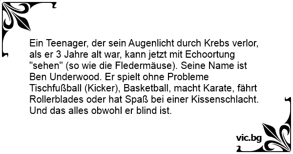 Ein Teenager, der sein Augenlicht durch Krebs verlor, als er 3 Jahre alt war, kann jetzt mit Echoortung "sehen" (so wie die Fledermäuse). Seine Name ist Ben Underwood. Er spielt ohne Probleme Tischfußball (Kicker), Basketball, macht Karate, fährt Rollerblades oder hat Spaß bei einer Kissenschlacht. Und das alles obwohl er blind ist.