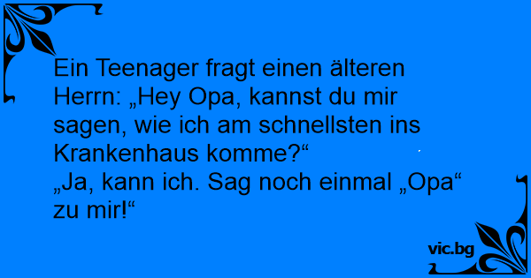 Ein Teenager fragt einen älteren Herrn: „Hey Opa, kannst du mir sagen, wie ich am schnellsten ins Krankenhaus komme?“