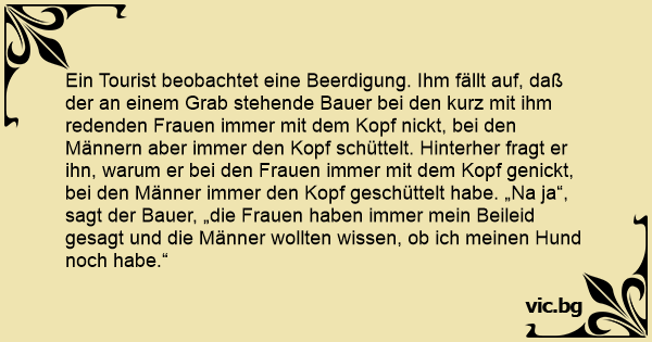 Ein Tourist beobachtet eine Beerdigung. Ihm fällt auf, daß der an einem Grab stehende Bauer bei den kurz mit ihm redenden Frauen immer mit dem Kopf nickt, bei den Männern aber immer den Kopf schüttelt. Hinterher fragt er ihn, warum er bei den Frauen immer mit dem Kopf genickt, bei den Männer immer den Kopf geschüttelt habe. „Na ja“, sagt der Bauer, „die Frauen haben immer mein Beileid gesagt und die Männer wollten wissen, ob ich meinen Hund noch habe.“